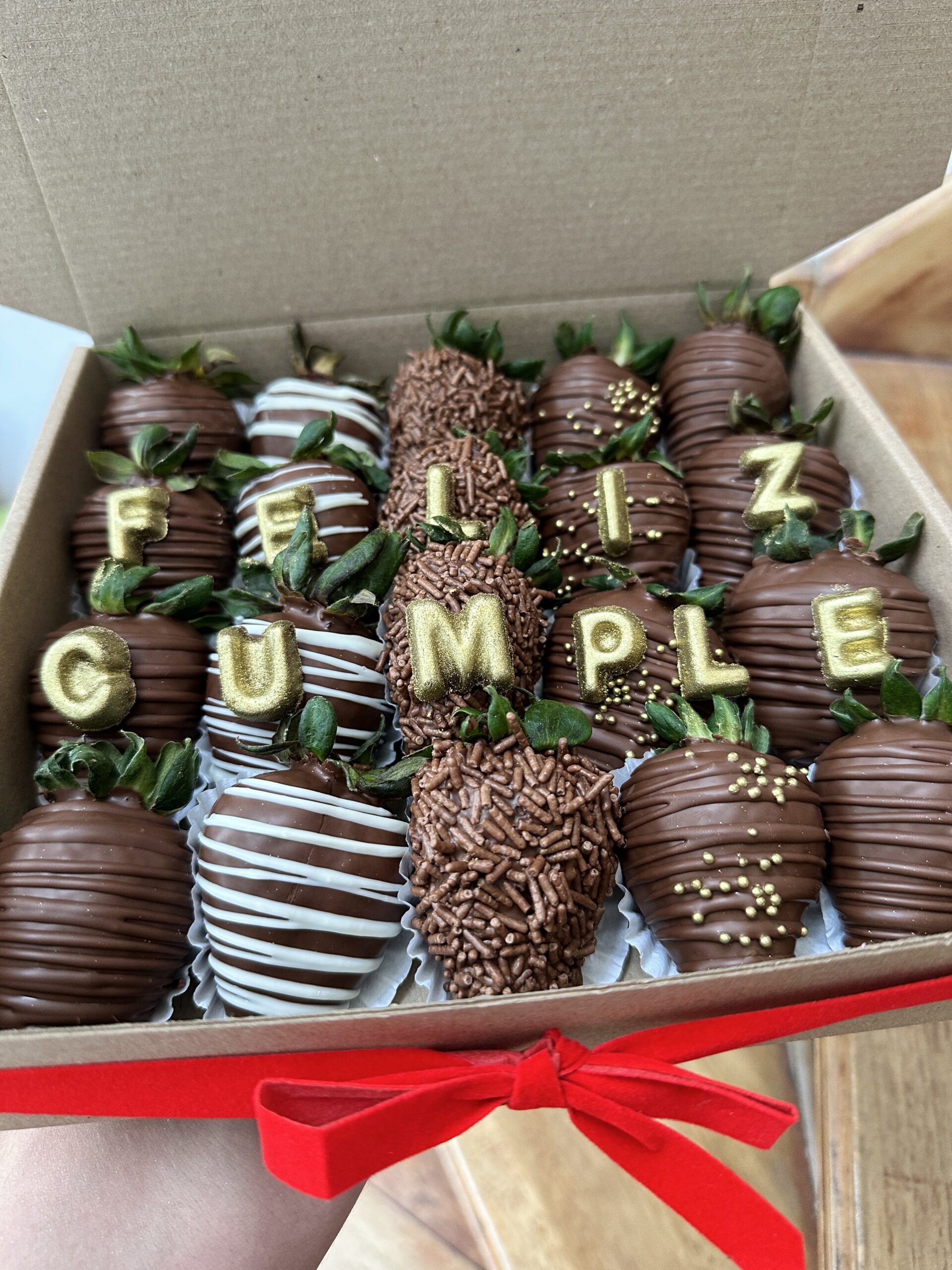 Caja de 20 fresas cubiertas con chocolate de leche, chocolate semiamargo y chocolate blanco. El diseño se puede personalizar, la caja incluye moño decorativo y tarjeta con mensaje.