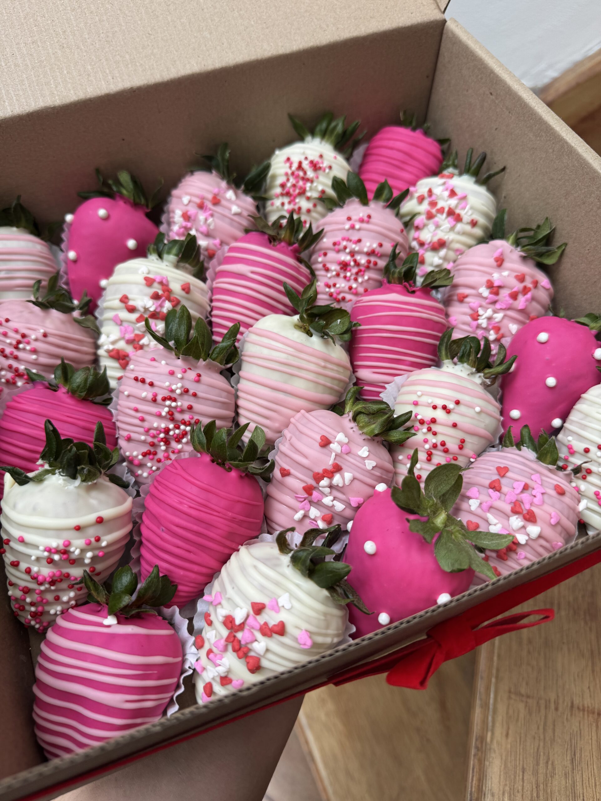Caja de 25 fresas con chocolate Blanco, rosado y fucsia