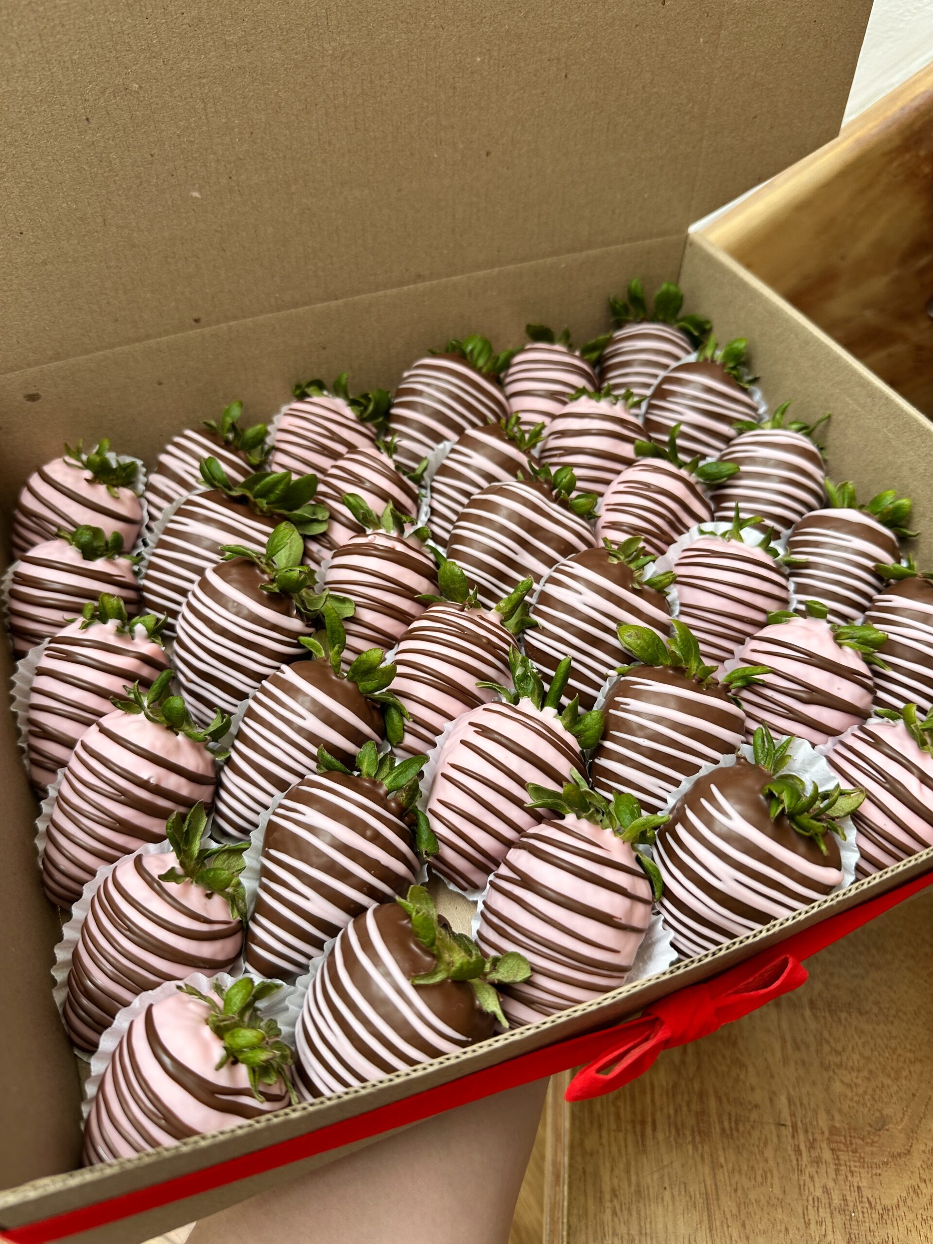 Caja de 36 fresas con chocolate oscuro y rosado